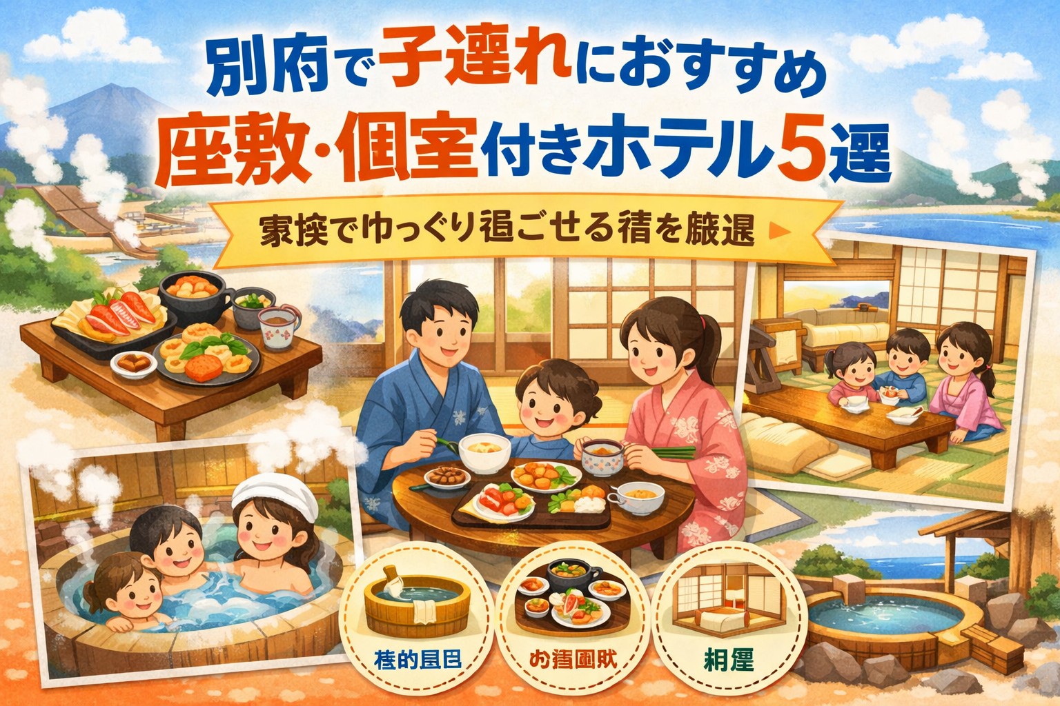 別府で子連れでも気兼ねなく泊まれる宿を探したい、できれば座敷や和室があって、食事も個室感のある環境でゆっくり楽しみたい。そんな家族旅行の宿選びは、思った以上に迷いやすいものです。